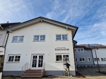 Weiter wurde an der neu gestrichenen/gestalteten Fassade Richtung Denkmalstraße und Richtung Alte Bundesstraße die neue Gebäudebeschriftung angebracht. Sie ist an die Beschriftung aller neueren Gemeindegebäude (Feuerwehr, Bauhof, Bäckerei/Gelateria) angelehnt, stärkt so also wieder die Corporate Identity der Gemeinde.